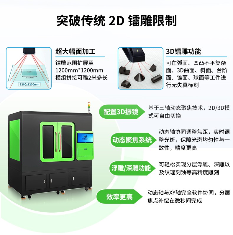 與傳統加工工藝如絲網印刷、熱壓成型、化學蝕刻等相比,3D大幅面激光鐳雕技術具有以下顯著優勢: