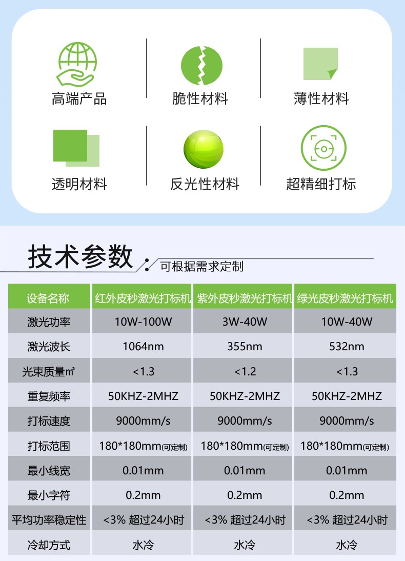 針對皮秒級、高精度、快速加工需求專門研發的高端激光打標設備,采用超短脈沖皮秒激光,可對各種材料進行超精細打標,適合對標記精細度要求非常高的產品及脆性材料加工,特別適合透明、反光性強的材料精細打標。具有良好防偽效果和抗蝕刻、抗氧化等功能。在醫療器械,醫療用品,手術刀具,汽車精密器件,電子元器件,模具精雕,芯片,光伏太陽能,高端產品超精細打標表現優異,備受青睞。