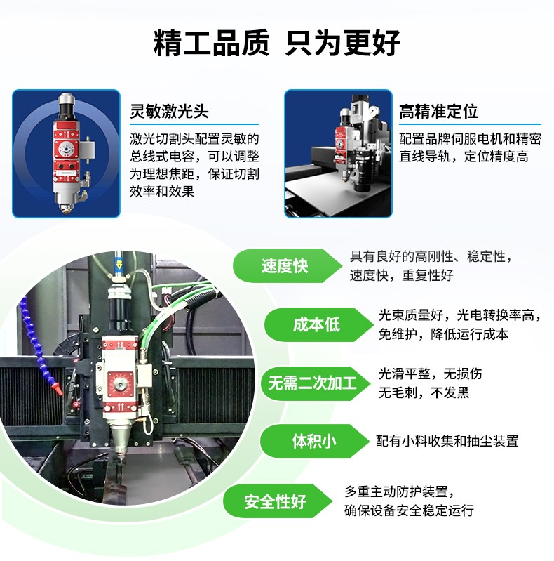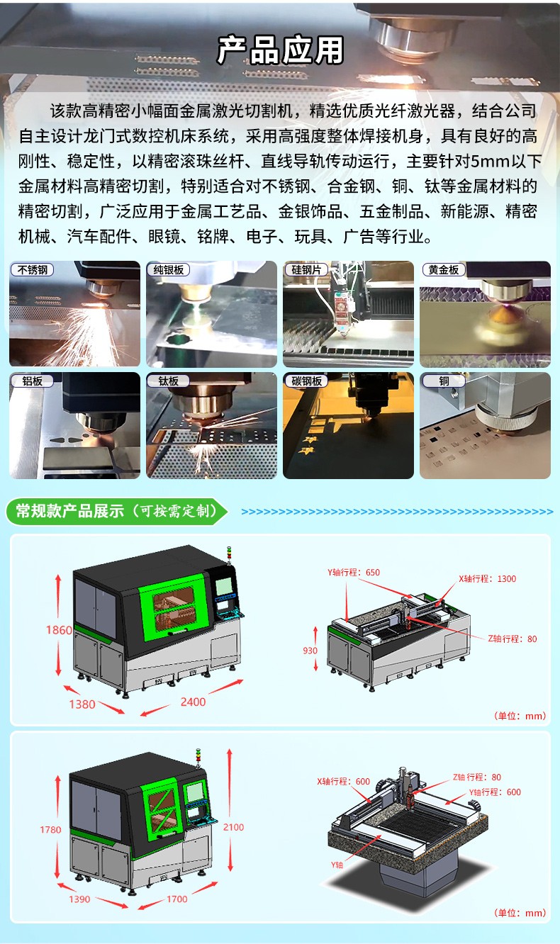 該款高精密小幅面金屬激光切割機(jī),精選優(yōu)質(zhì)光纖激光器,結(jié)合公司自主設(shè)計(jì)龍門式數(shù)控機(jī)床系統(tǒng),采用高強(qiáng)度整體焊接機(jī)身,具有良好的高剛性、穩(wěn)定性,以精密滾珠絲桿、直線導(dǎo)軌傳動運(yùn)行,主要針對5mm以下金屬材料高精密切割,具有精度高、速度快、轉(zhuǎn)化率高、免維護(hù)、運(yùn)轉(zhuǎn)成本低、體積小等一系列優(yōu)點(diǎn),特別適合對不銹鋼、合金鋼、銅、鈦等金屬材料的精密切割,廣泛應(yīng)用于金屬工藝品、金銀飾品、五金制品、新能源、精密機(jī)械、汽車配件、眼鏡、銘牌、電子、玩具、廣告等行業(yè)。