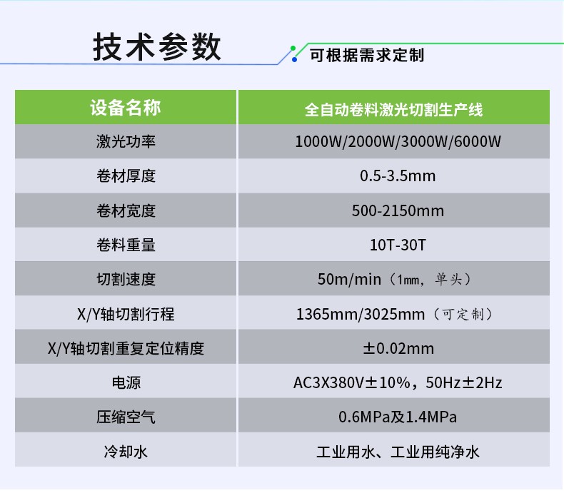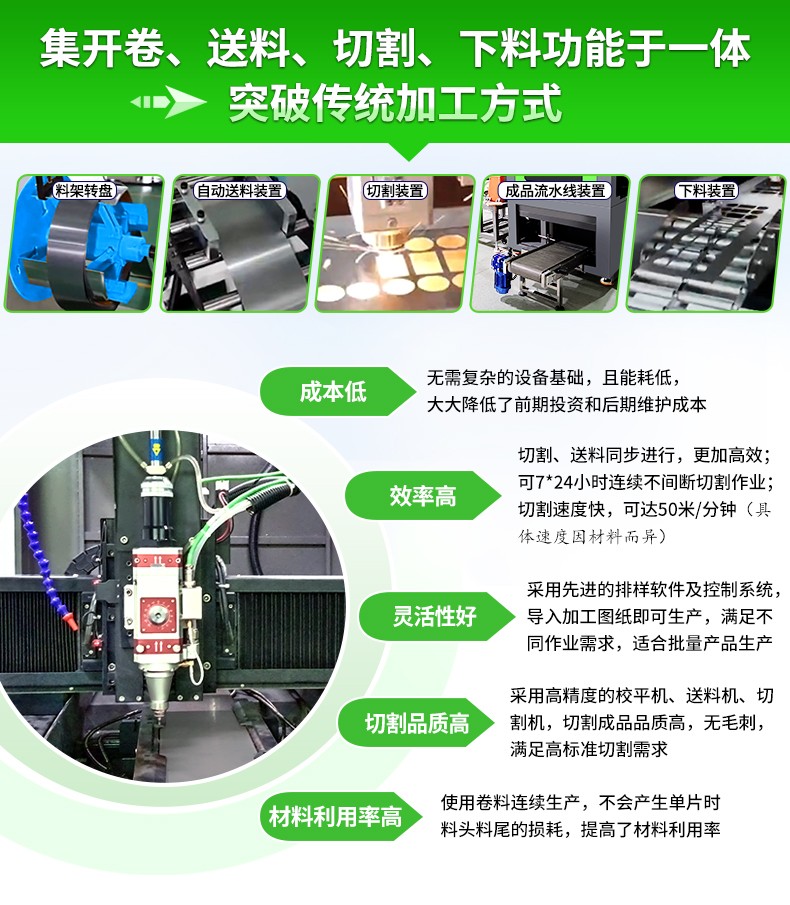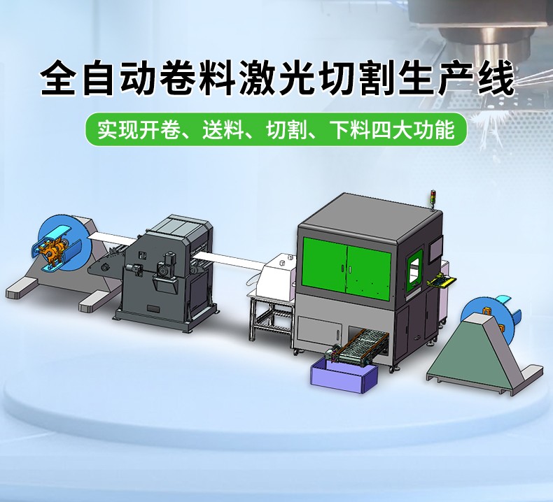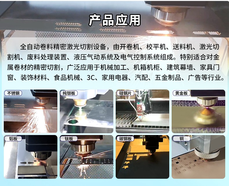 全自動卷料精密激光切割設備,由開卷機、校平機、送料機、激光切割機、廢料處理裝置、液壓氣動系統及電氣控制系統組成。特別適合對金屬卷材的精密切割,廣泛應用于機械加工、機箱機柜、建筑幕墻、家具門窗、裝飾材料、食品機械、3C、家用電器、汽配、五金制品、廣告等行業。