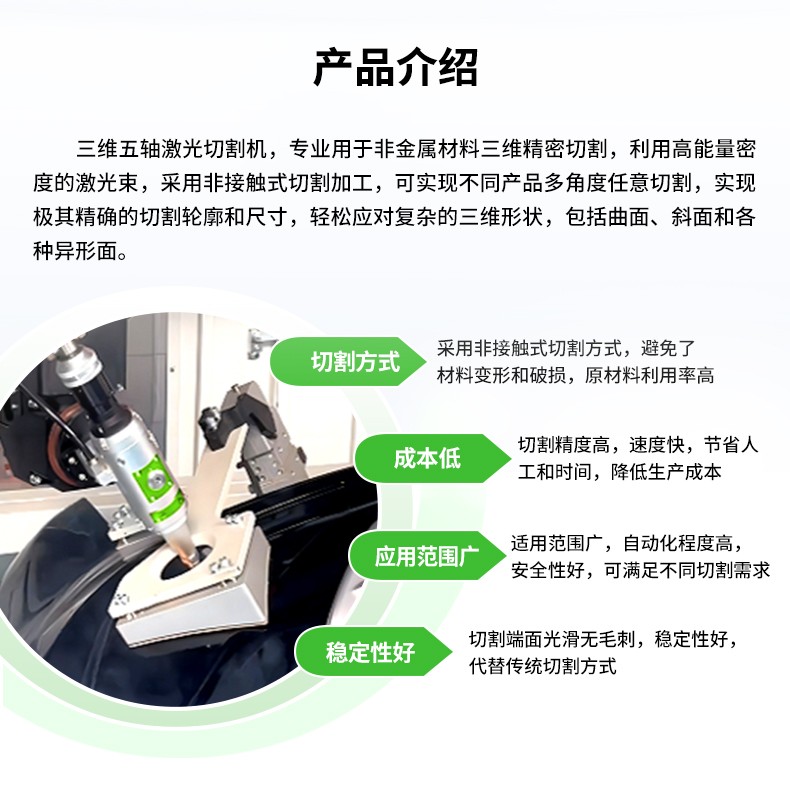 專業用于非金屬材料三維立體精密切割,可實現不同產品多角度任意切割,實現極其精確的切割輪廓和尺寸,
